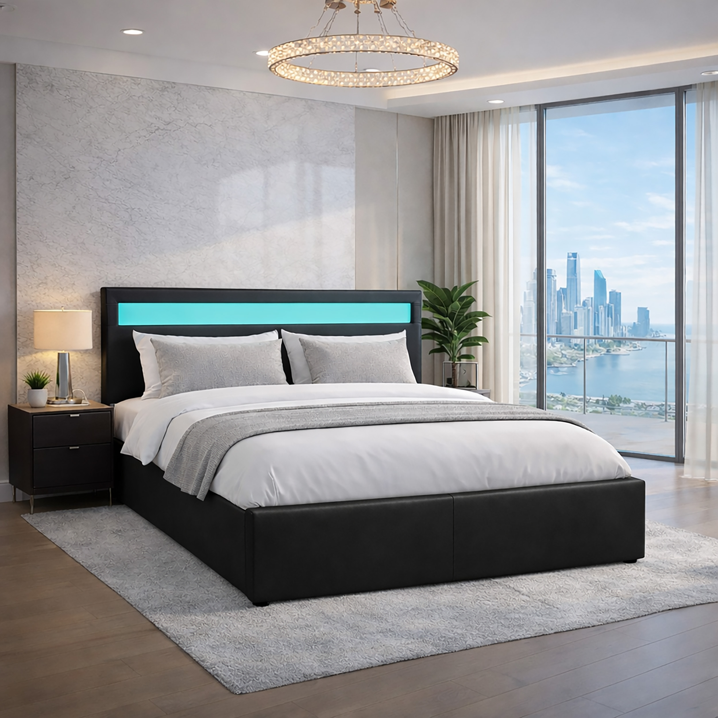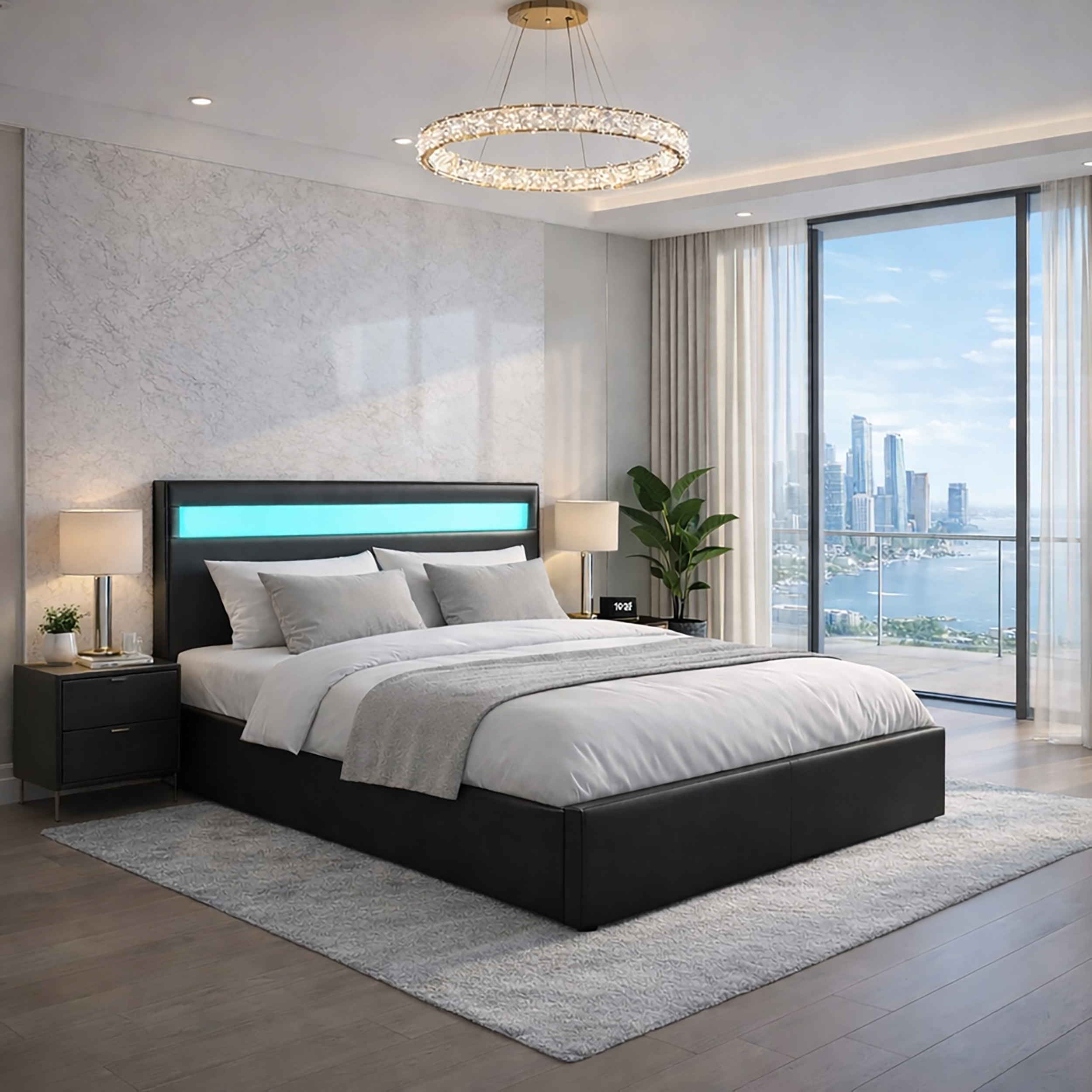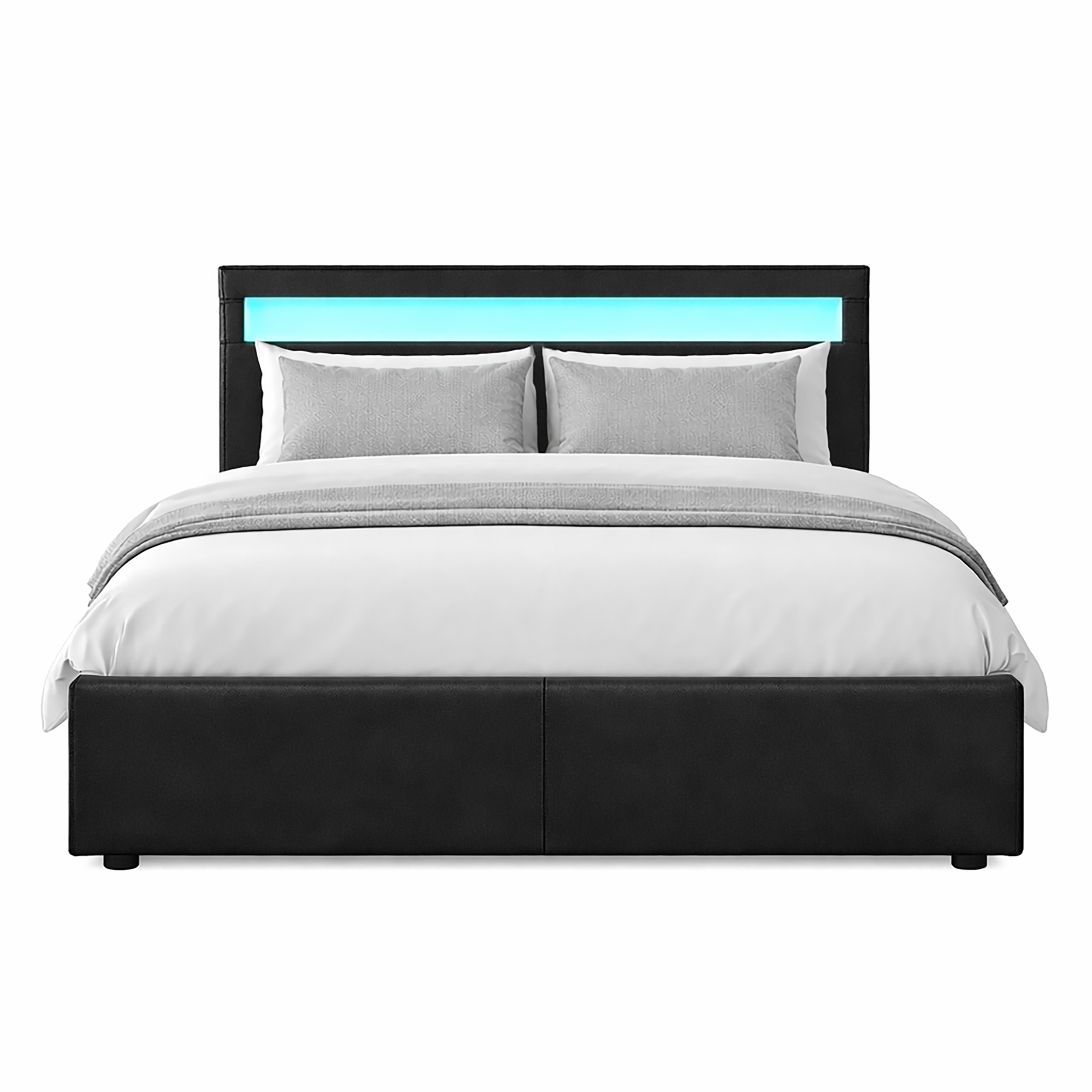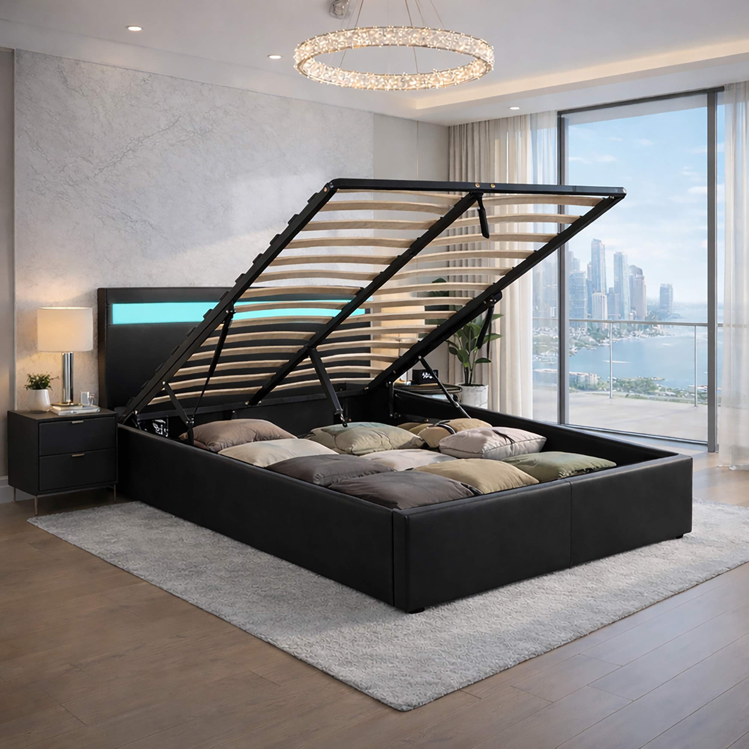Modern LED Ottoman Storage Bed Frame – 4ft6 Double Bed with RGB Headboard Lighting & Remote Control