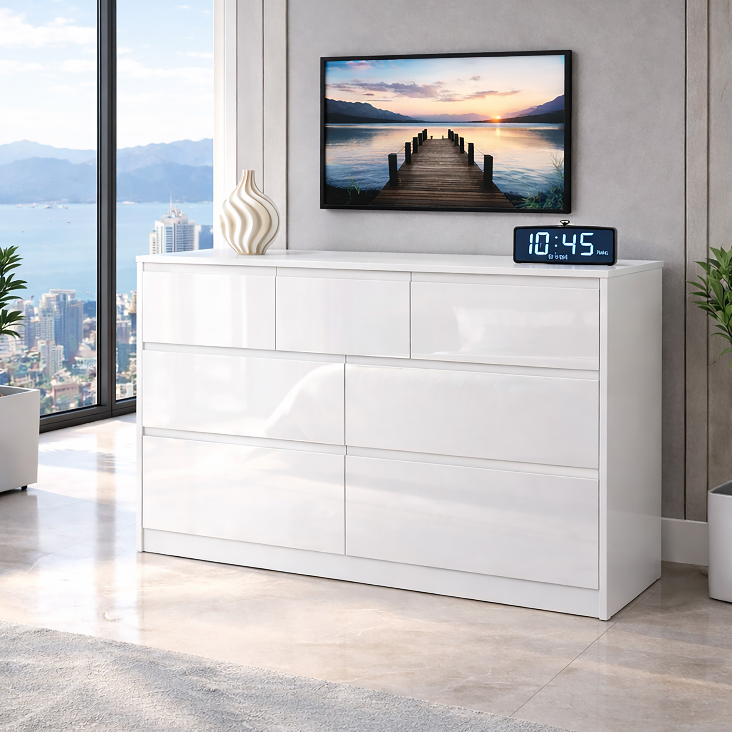 This 7 drawer Handleless chest is an excellent addition to our high gloss bedroom furniture range of Sleek and Stylish furniture. They can take a remarkable amount of weight due to the high strength manufactured wood veneer frame. The drawers fit flush and are manufactured to strict conditions which mean they are stable and firm. With its clean simple design and rich high gloss finish to the drawer fronts, this chest will blend in seamlessly with any modern or traditional bedroom.